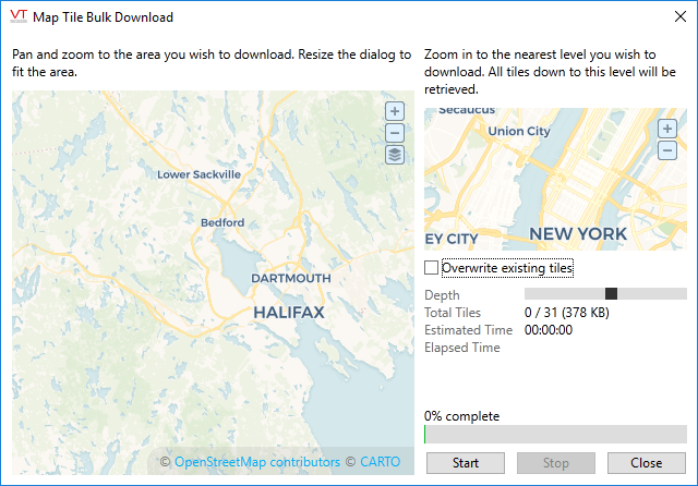 (New York was chosen for the focus of this map because it contains detail down to the nearest zoom level, which may not be the case in your selected area. This does not affect the area for which you will be downloading tiles.) - Tiles will be downloaded for the entire area in the larger window, for all zoom levels from that shown in the area selection map down to that shown in the zoom level map.