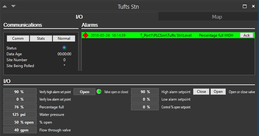 The Alarms list will be populated with all current alarms associated with the driver. Operators may use the Ack button here to acknowledge any given alarm.