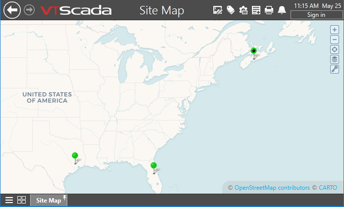 A Site Map is a dynamically-loaded map, primarily used to show the location of any of the site-related tags: Polling drivers, DataFlow RTU drivers, MultiSmart™ stations, MPE™ Duplexer stations, or MPE™ SC stations. You can also link a Context tag (or a user-created type derived from a Context tag) to a map by adding the properties "Latitude" and "Longitude" to the parameter list. A Site Map is a standard part of the menu, and is built into every automatically-generated lift station details page and into the Site Details page. While you can add extra Site Maps to pages within your application using the Site Tools palette or the Menu, it is usually not necessary or beneficial to do so.