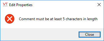 After setting a value for the property RepositoryCommentMinLen, users will see a dialog similar to the following if they do not provide the required number of characters.