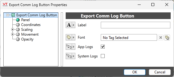 The Export Comm Log Widget is a button that users can press to export communication log files instantly rather than waiting for a time or numeric limit to trigger the write.