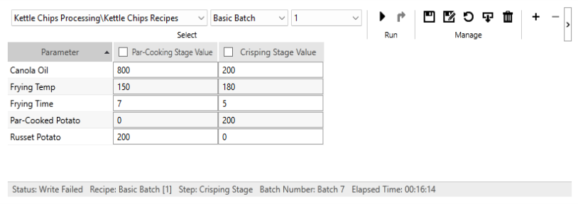 The Batch Status widget is used to display information about a recipe batch. Details include the name of the linked recipe tag, the current status, the recipe name, batch number and the last write time.