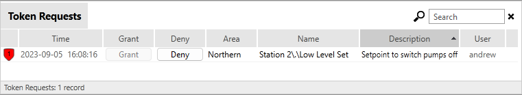 A Tokens Requests List widget is an Alarm List widget, configured to display active Control Token Requests.