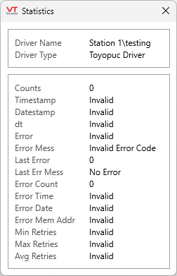 The Show Stats button will display the following information about a Toyopuc driver tag.