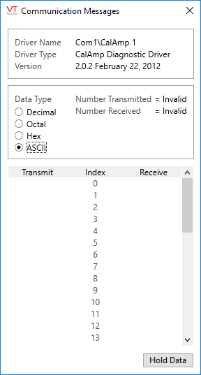 If one has the protocol information for the CalAmp hardware, one can interpret each of the transmitted and received bytes to determine their meaning. The basic information that can be obtained from the Communication Messages window is that communications are proceeding as normal as long as bytes appear in both the Transmit and Receive columns.