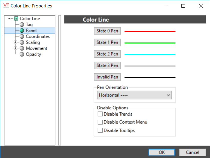 Use the Pen Orientation drop-down list to select one of four orientations for the completed Color Line object (horizontal, vertical, left 45 degrees, or right 45 degrees). The orientation remains the same for all tag states.