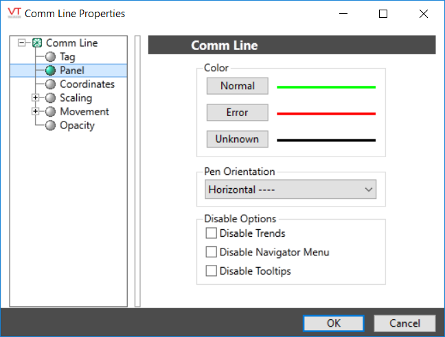 The Comm Line tag widget is used to draw a line that changes any combination of color, width and style to indicate the state of the associated tag. Used for port tags rather than digitals.