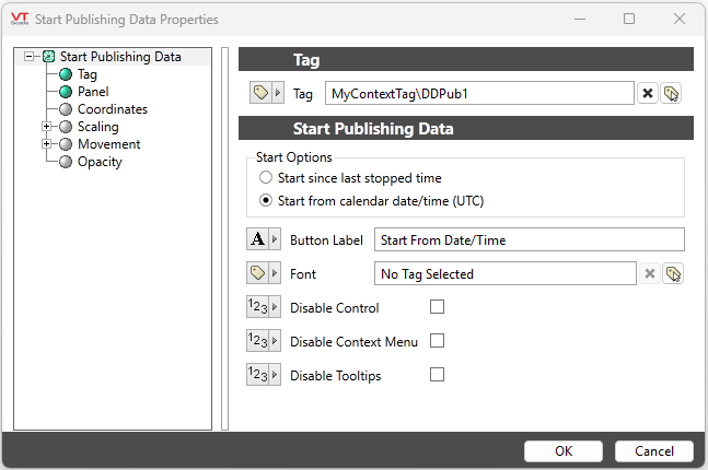 Start from calendar date (UTC) - Clicking will open a calendar and allow you to select a date. Transmissions will begin from the selected date until present and continue to transmit live data. Selecting this option will transform your widget into Data Diode Start From Date/Time Button