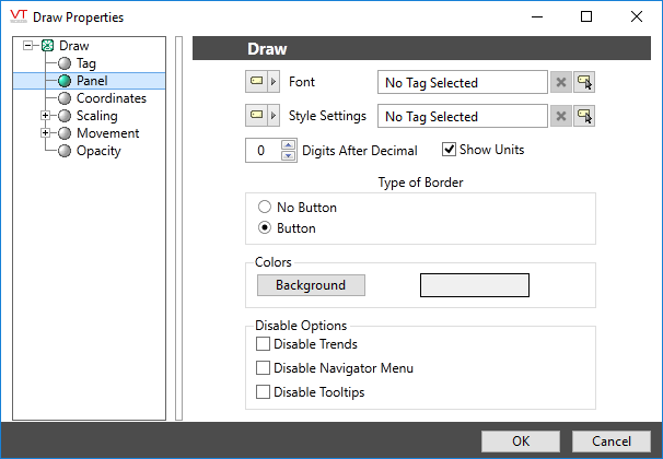 The Draw tag widget is used to display a bordered field containing the description of the associated tag on the left, and its value to the right. The description and the border are optional.