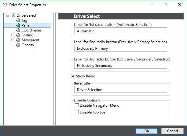 Available only when the bevel is shown around the radio button cluster. If you have more than one DriverMux tag in your application, it would be appropriate to make the title describe which is being affected by the operator’s choices.