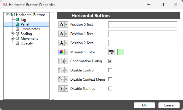 Set the labels that will appear on the buttons. The buttons are drawn from left to right and match the Position 0 through Position 2 settings of the associated selector switch.