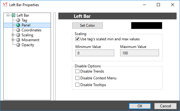 These fields become editable when the widget is used to display a function or Calculation tag. The most common use is to provide an output range of 0 to 100 (%) given a data source whose numbers do not match these values (perhaps ranging from 20 to 80, for example). Set the low scale range to the value expected from the data source when it is at its minimum and the high scale range to the value expected from the data source when it is at its maximum.