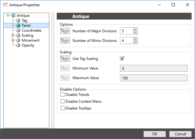 You can override those values to set your own scale range. For example, assume that you have a tag for which the minimum and maximum scaled process values are 20 and 80 respectively. Drawing this tag with a minimum value of 0 and a maximum value of 100 will result in a meter that shows a full range of numbers from 0 to 100, but whose needle will move only between 20 and 80.