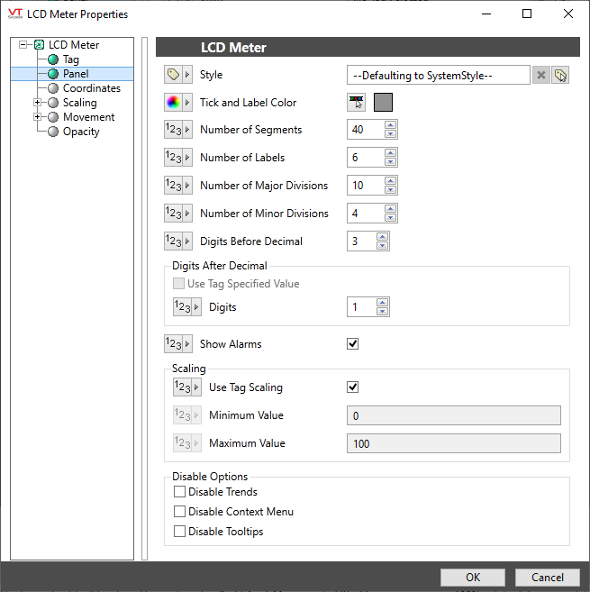 You can override those values to set your own scale range. For example, assume that you have a tag for which the minimum and maximum scaled process values are 20 and 80 respectively. Drawing this tag with a minimum value of 0 and a maximum value of 100 will result in a meter that shows a full range of numbers from 0 to 100, but whose needle will move only between 20 and 80.