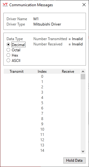 If one has the protocol information for the Mitsubishi PLC, one can interpret each of the transmitted and received bytes to determine their meaning. The basic information that can be obtained from the Communication Messages window is that communications are proceeding as normal as long as bytes appear in both the Transmit and Receive columns.