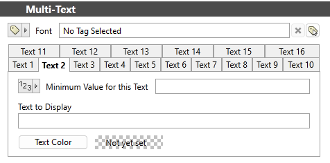 Select each tab in turn, up to the number of messages you wish to display. Each tab after Text 1 sets a trigger point using either a constant, tag or parameter, and message + color combination to display when that point is passed. Each consecutive tab used must set a greater trigger point than the previous.