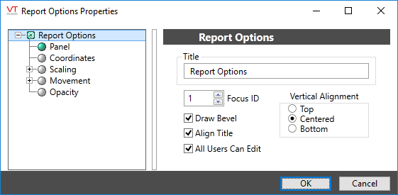 The properties dialog for the Report Options widget:
