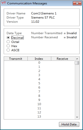 If one has the protocol information for the Siemens S7 PLC, one can interpret each of the transmitted and received bytes to determine their meaning. The basic information that can be obtained from the Communication Messages window is that communications are proceeding as normal as long as bytes appear in both the Transmit and Receive columns.