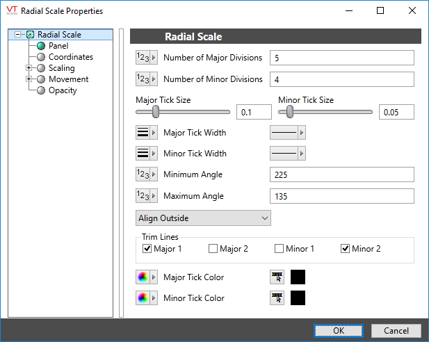 The Radial Scale Widget represents the associated tag's minimum and maximum scale range as a series of major and minor tick marks. The scale will always be round, regardless how the bounding box is stretched. In all cases, the smaller dimension of the bounding box will be used to set the diameter of the scale.