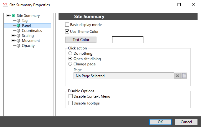The usual action upon clicking a Site Icon dot is for the site dialog to open. This dialog-type page is built into your application. As an alternative, you may choose to have no action occur, or you may select any page that you have created for the site. If using your own page instead of the site dialog, you should consider parameterizing that page so that it may display the tags relevant to the given server. See: Page Properties Parameters Tab.