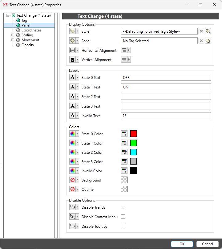 The Text Change tag widget is used to represent the associated tag's value as a text string that changes (text or color) based on the tag's value. While this widget is available to analogs, it is most commonly used with digital and other tags that have clearly defined states (values from 0 up to 3).