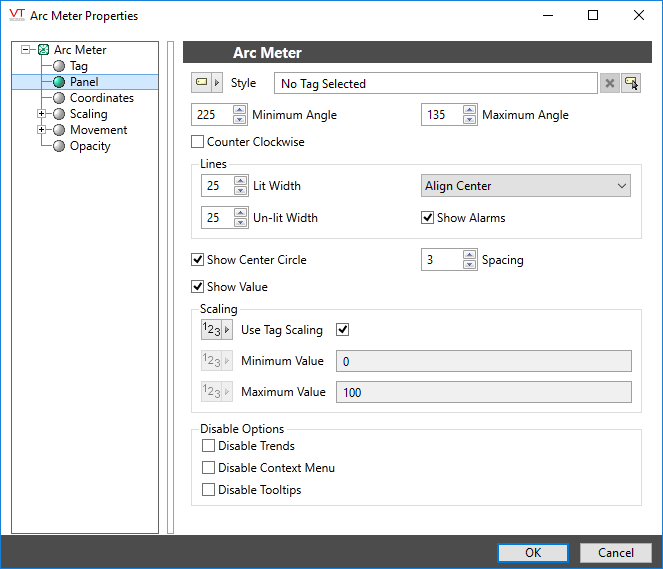 If Use Tag Scaling is selected, the minimum and maximum range of the meter will be controlled by the tag's scaled minimum and maximum values.