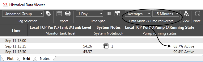 • In the grid view, when viewing averages over a time span that is greater than the logging rate, a % active value will show you what percentage of the logged values within that time span had a value of 1.