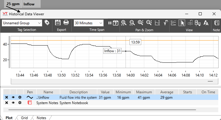 VTScada makes it easy to view a trend plot of a tag's values over time. You need only left-click on an object that represents an input tag (analog or digital) to open a trend graph. Click more widgets to add more pensClosed Any data source displayed on the graph. This includes notebooks as well as analog and digital tags. to the graph or use the Tag Selector button within the HDV toolbar.