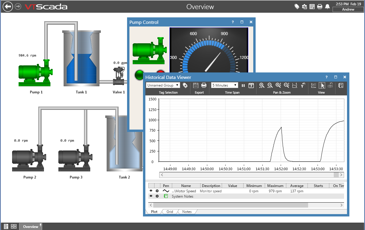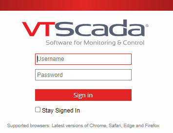 The user interface is nearly identical to a full VTScada workstation installation, allowing for minor differences in font and window details that may occur from one browser to another. All the features of a run-time VTScada installation are enabled except for: