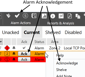 The ability to acknowledge alarms is controlled by the Alarm Acknowledge security privilege.