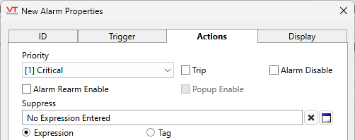 Customers who used VTScada prior to the release of this feature might have configured parameter expressions in their I/O & Calculation tags to disable alarms. Those expressions are automatically transferred to alarm suppression as part of the upgrade process.