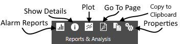 For operators and developers. Describes tools in the Reports & Analysis section of the Alarm Page title bar.