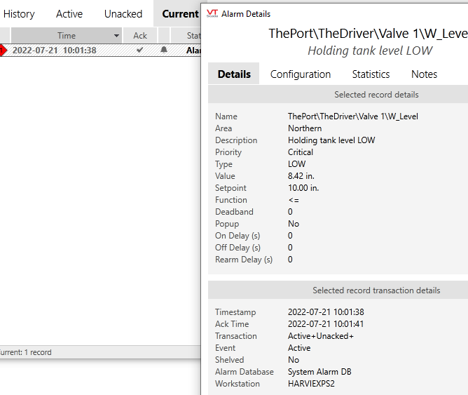 The details display shows fundamental information about the alarm including the configuration details that were in effect at the time the alarm occurred. Also included is the value of the trigger at the time that the alarm was activated, the database that the alarm is a part of, and related information as shown in the example.