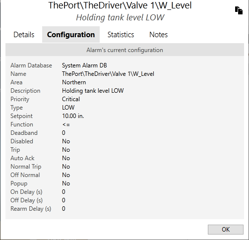 This dialog can be opened from the Alarm Page for any selected alarm. Use it to view all the available information about that alarm in one screen. This dialog provides more information than is available in the Alarm Page display, including configuration details for the alarm and statistics for how often it has occurred.