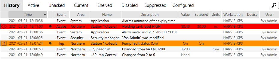 The History list provides more than a review of past alarms. It also provides a history of operational events including: