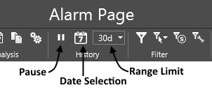 Several tools allow you to filter which alarms and events are shown, but there are no tools to sort the History list. The order is always by time, with newer alarms added to the top of the list.
