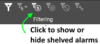 By default, shelved alarms are excluded from all lists except the one where they are the only type of alarm shown. Use the button shown here to include or exclude shelved alarms in your lists.