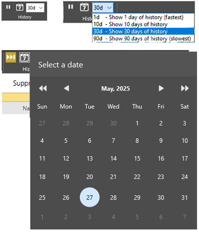 Date selection tools for the history list