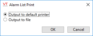 While viewing the alarm page, click the printer icon. The full list of alarms will be included. Note that you may limit this using filters for the alarm list. The prompt dialog will ask you for a destination for the output.