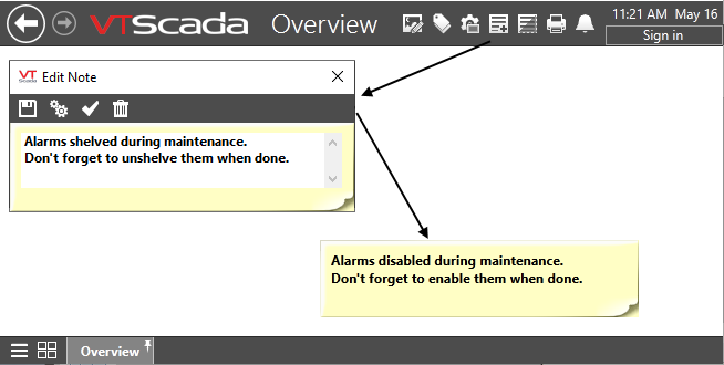 Use Page Notes to add reminders on any VTScada page. (The ability to create and edit page notes is controlled by the security privilege, Page Note Edit.)