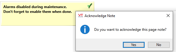 If you need a record that an operator has read a page note, you can "arm" it by clicking the check mark in the Edit Note dialog. When a note is armed, the next time that anyone clicks it, VTScada shows the following dialog: