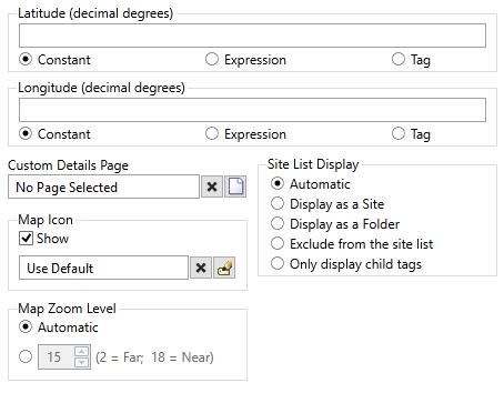 Required. DispParmsStruct of site parameter indices. Invalid entries in this structure are assumed to be missing parameters. The corresponding control will be grayed out. This parameter is typically created as follows in your module initialization state. SiteDispIdxs = \DispParmsStruct(); SiteDispIdxs\Latitude = \#Latitude; SiteDispIdxs\Longitude = \#Longitude; SiteDispIdxs\CustomDetailsPage = \#CustomDetailsPage; SiteDispIdxs\CustomMapIcon = \#CustomMapIconParm; SiteDispIdxs\SiteListDisplay = \#SiteListDisplay; SiteDispIdxs\InitZoom = \#InitZoom; |