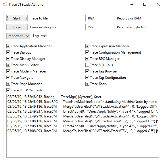 Start and stop the tracing of the selected actions to a special text file named, "VTSTrace.txt" (located within your VTScada installation directory (e.g. C:\VTScada\VTSTrace.txt). When the button is toggled on (depressed and labeled "Stop"), VTScada is tracing the specified actions to file. When the button is toggled off (labeled "Start"), VTScada has stopped tracing the specified actions to file. As mentioned in the note above, by default, VTScada now traces all actions to a "VTSTraceAll.txt" file, located in your VTScada installation directory.