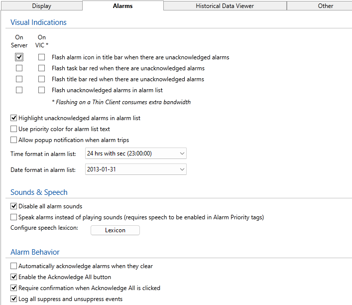 When selected, unacknowledged alarms in the alarm list will flash, to draw operator attention. Separate options exist for the server and VIC If your internet connection is limited by bandwidth restrictions, we recommend that you do not enable this option for the VIC display. |